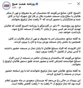 روزنامه هشت صبح در گزارشی مدعی شد که محاسبان امر باالمعروف و نهی از منکر با ورود به مسجد حضرت بلال واقع در فاز اول شهرک آریا (کابل)، نمازگزاران را مجبور به خواندن ۲۰ رکعت نماز تراویح کرده‌ اند.